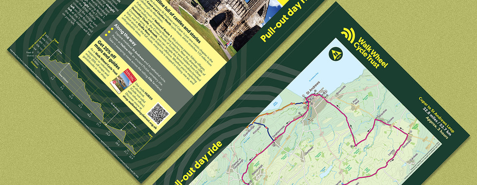 The ‘Walk Wheel Cycle Trust’ (the sustainable transport charity formerly known as Sustrans) recently approached us to design some printed, pull-out cycle route cards for them. The four double-sided route cards were to be slightly-less-than-A4 in size, and were to appear in their upcoming supporters’ newsletter. Four existing A5 maps we’d previously created for Sustrans were updated and recycled for this project, and the rest of the design needed to be in-keeping with their brand-new identity.